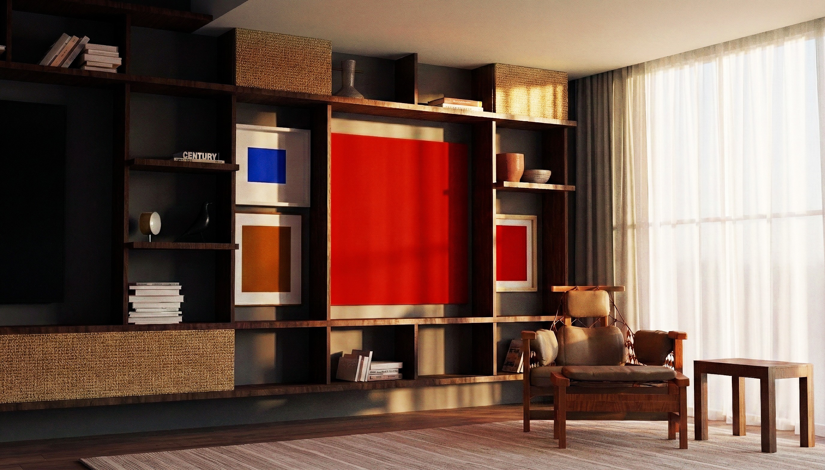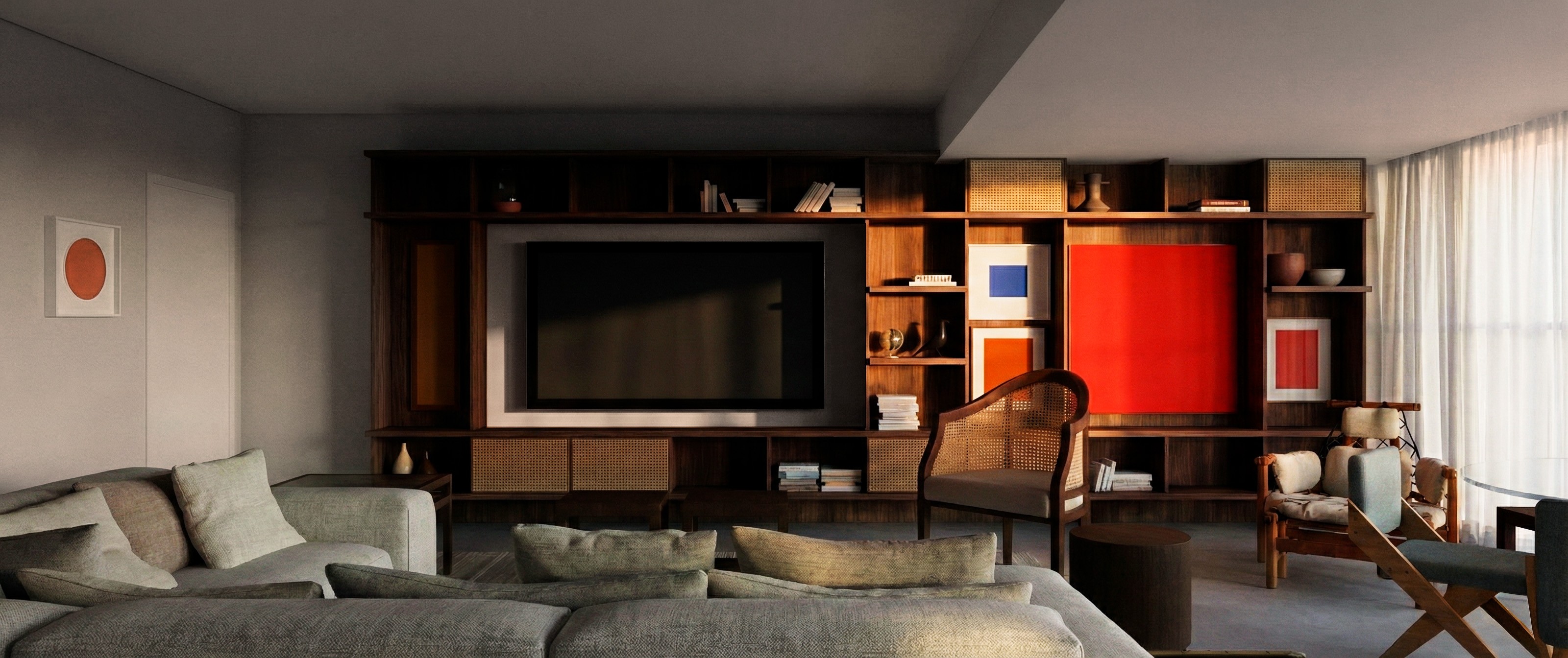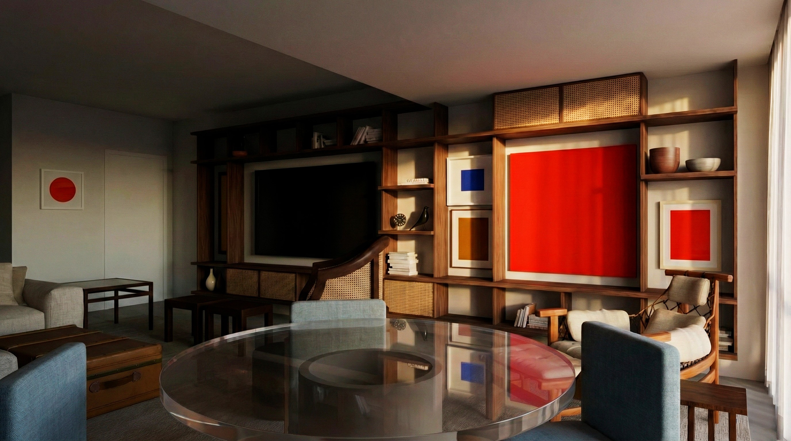 Esses painéis se integram ao sistema modular da estante, ocupando nichos de proporções equivalentes e respeitando o mesmo grid ortogonal que estrutura toda a peça. Essa lógica permite adaptações conforme o layout e as necessidades de cada ambiente, mantendo coerência formal mesmo quando a composição é reorganizada. O resultado é uma composição contínua, onde mobiliário e arte compartilham escala, ritmo e linguagem, dissolvendo hierarquias entre suporte e conteúdo.