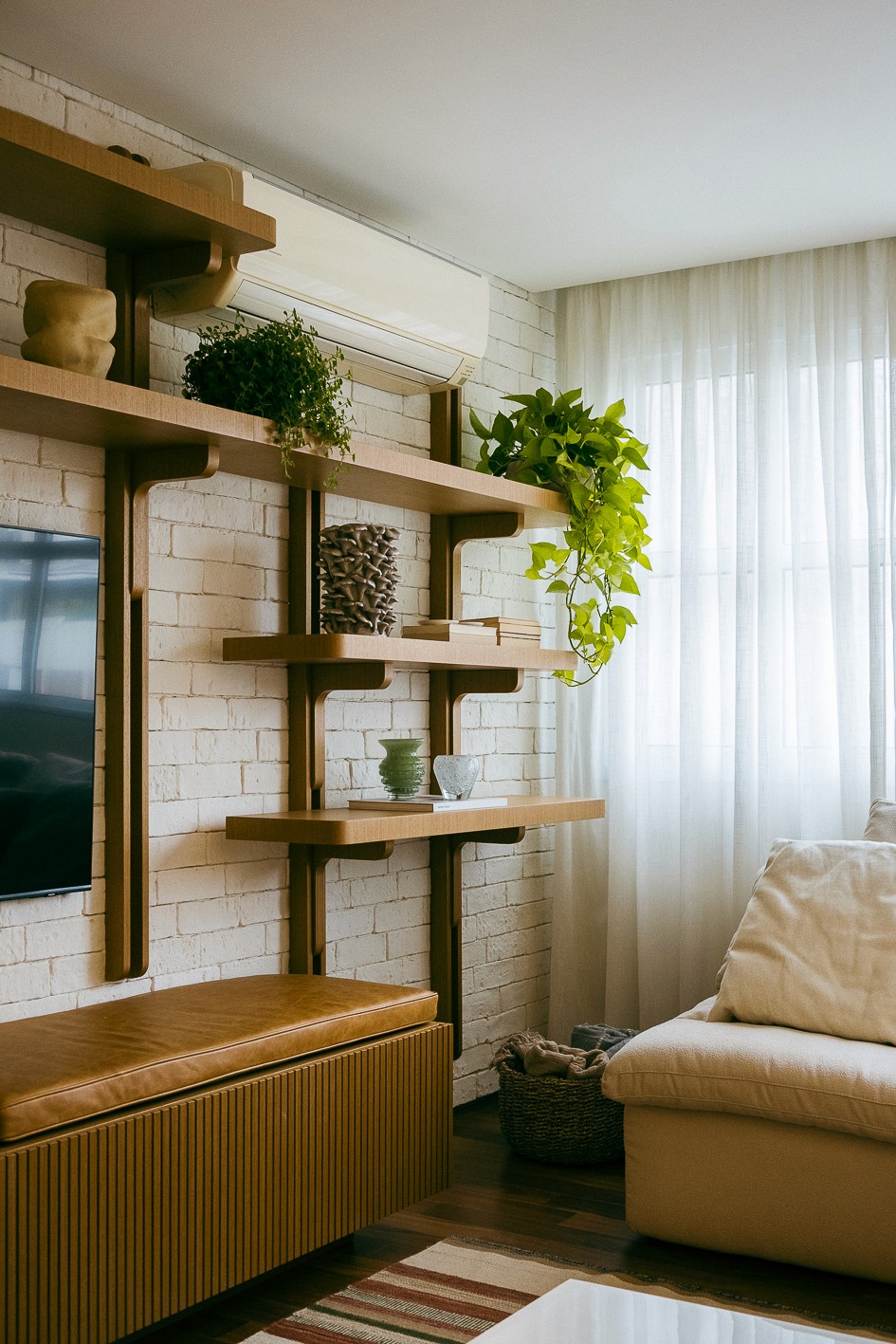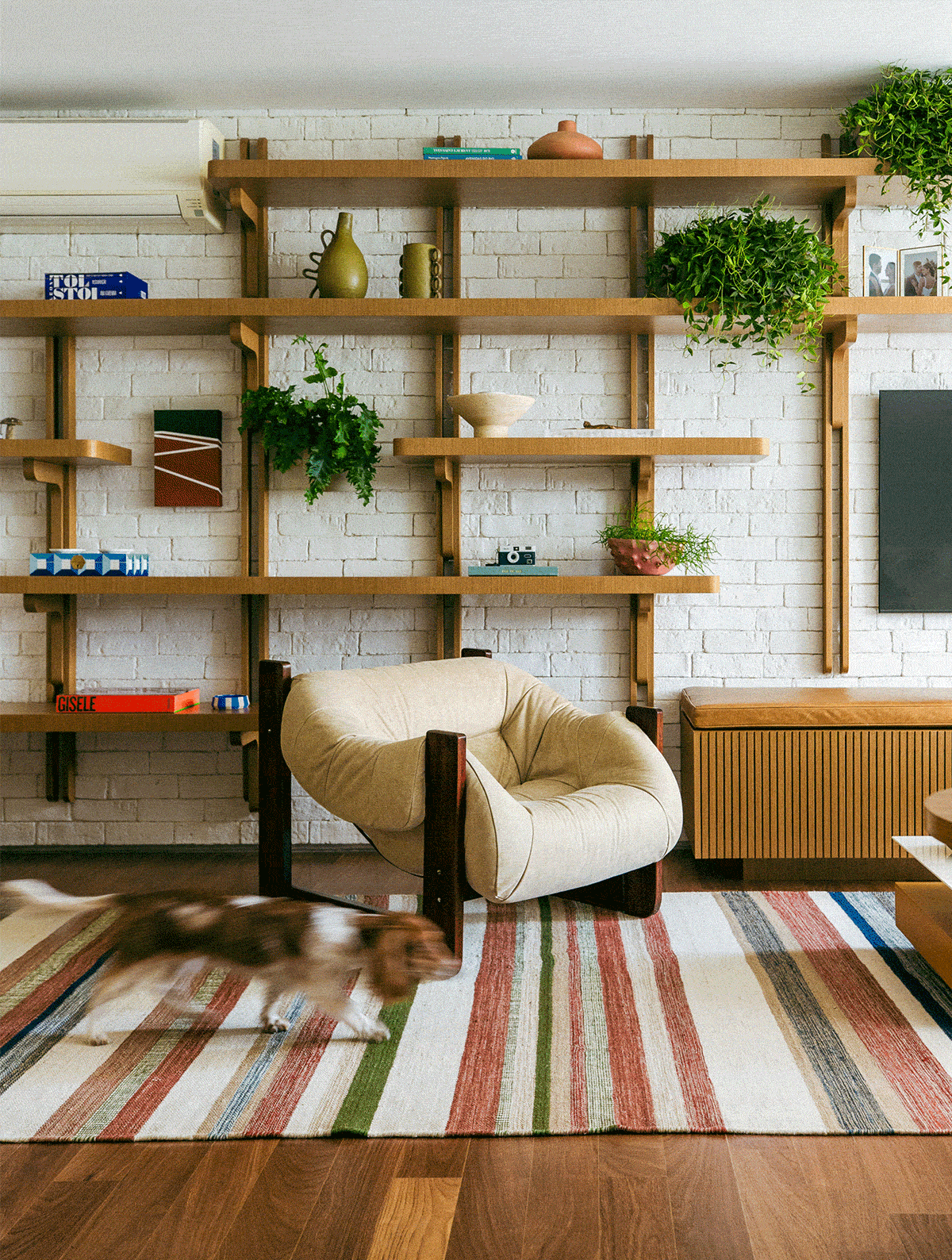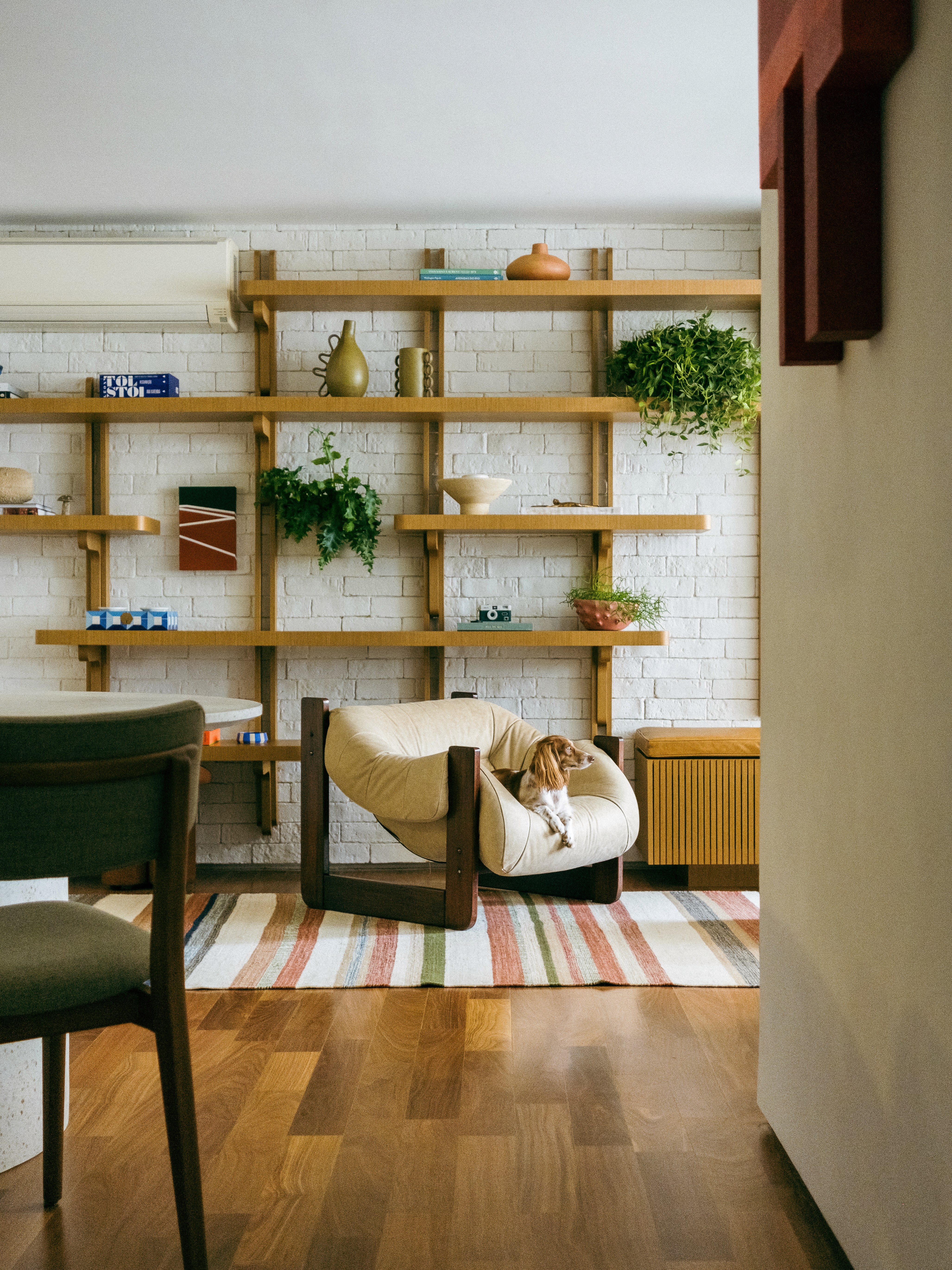Na área social, o ponto focal é a estante desenvolvida especialmente para o apartamento. Com sistema modular baseado em um grid pré-definido, a peça permite diferentes configurações e composições mais descontraídas — alinhadas à forma de uso dos moradores.