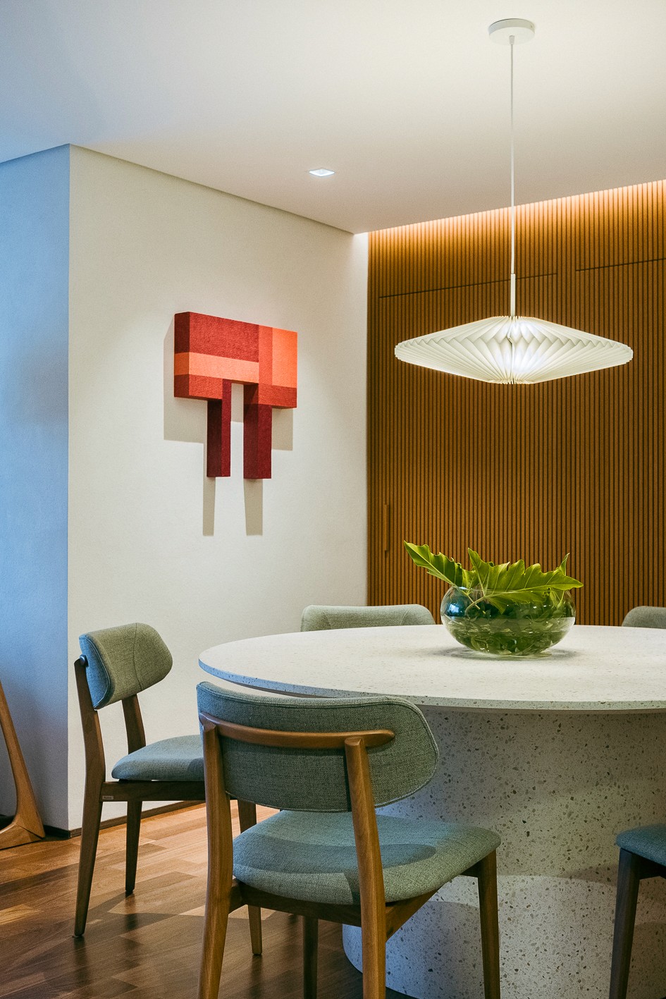 O conceito da Residência Pedroso foi guiado pelo desejo dos clientes de explorar diferentes materialidades e composições. A proposta parte da combinação de texturas distintas nas paredes e mobiliários, além de detalhes recorrentes que constroem a identidade visual do projeto.