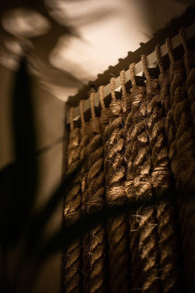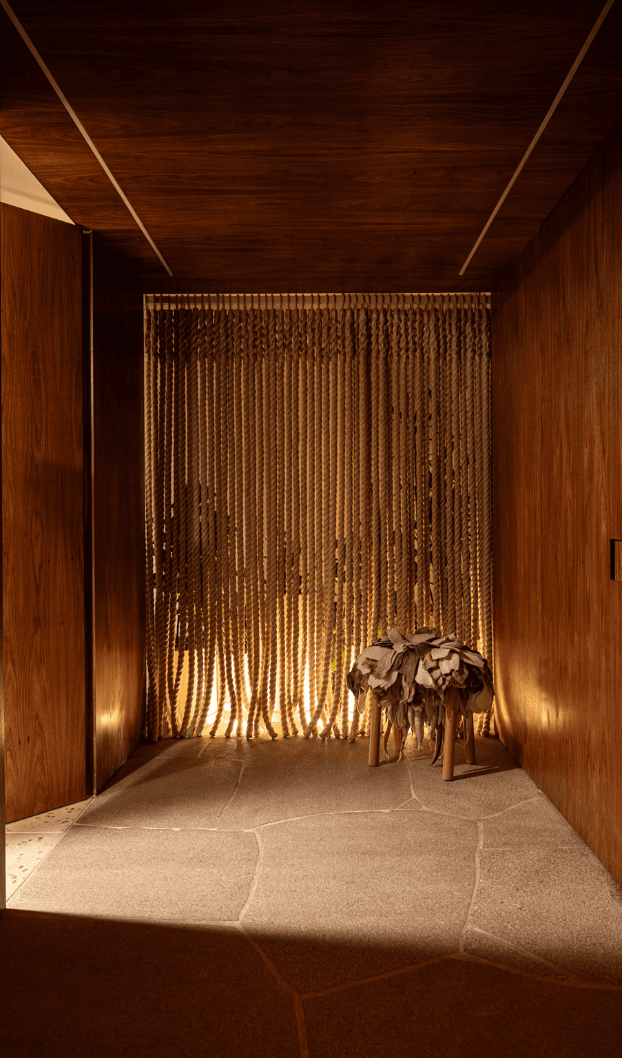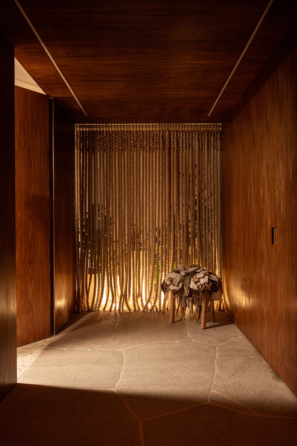 Um grande painel de cordas, desenhado especialmente pelo nosso escritório para este projeto, atua como elemento central: além de delimitar as salas, ele filtra a luz natural e integra a vegetação ao ambiente.
