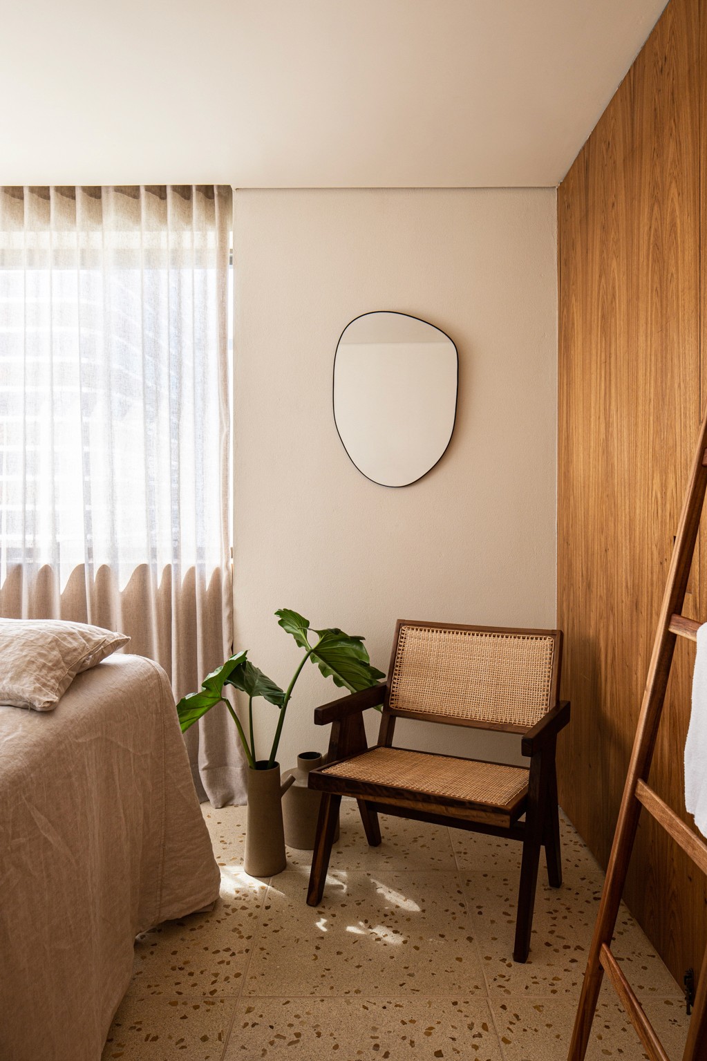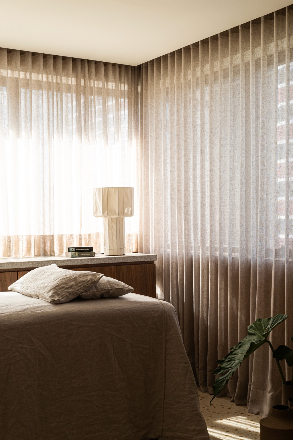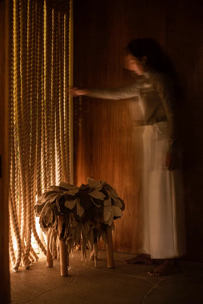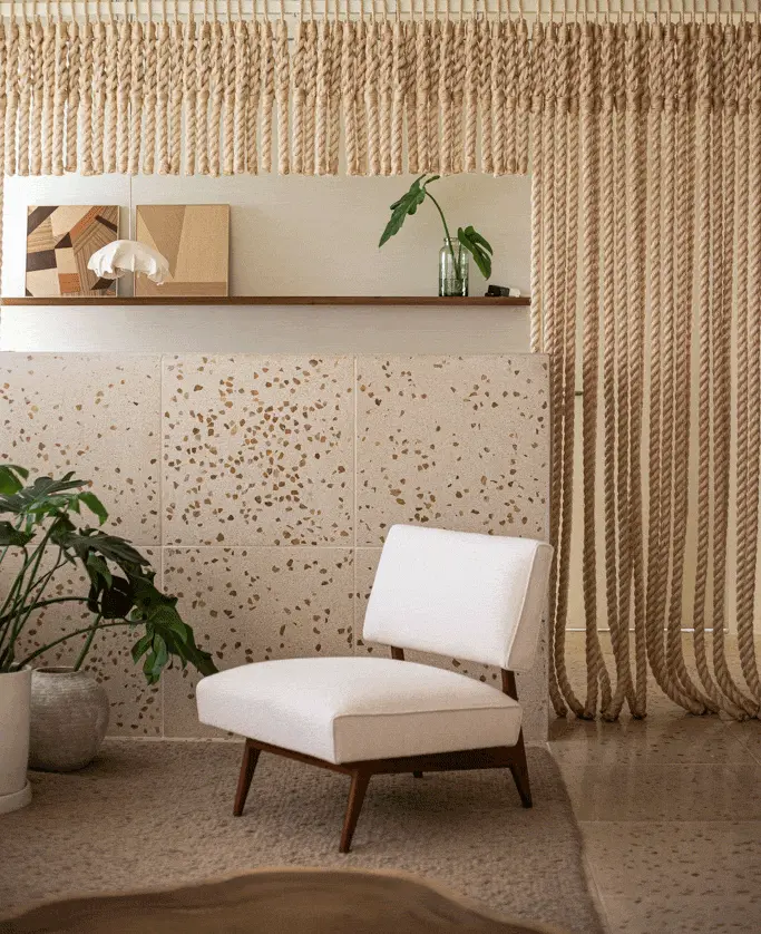 Um grande painel de cordas, desenhado especialmente pelo nosso escritório para este projeto, atua como elemento central: além de delimitar as salas, ele filtra a luz natural e integra a vegetação ao ambiente.