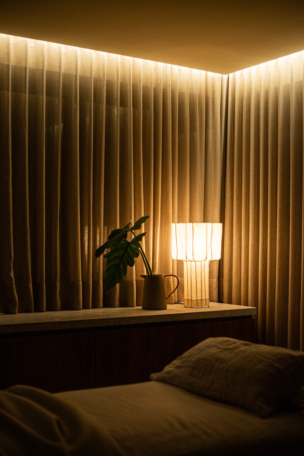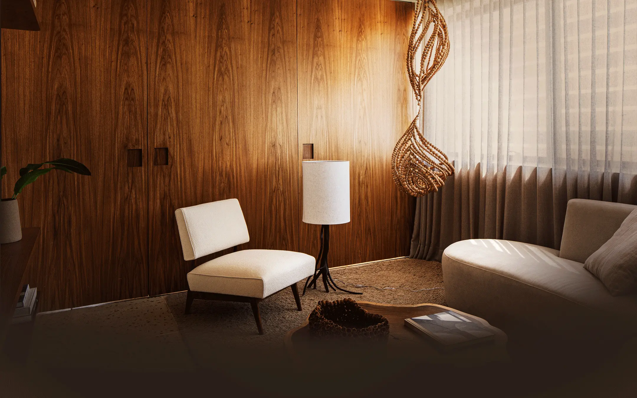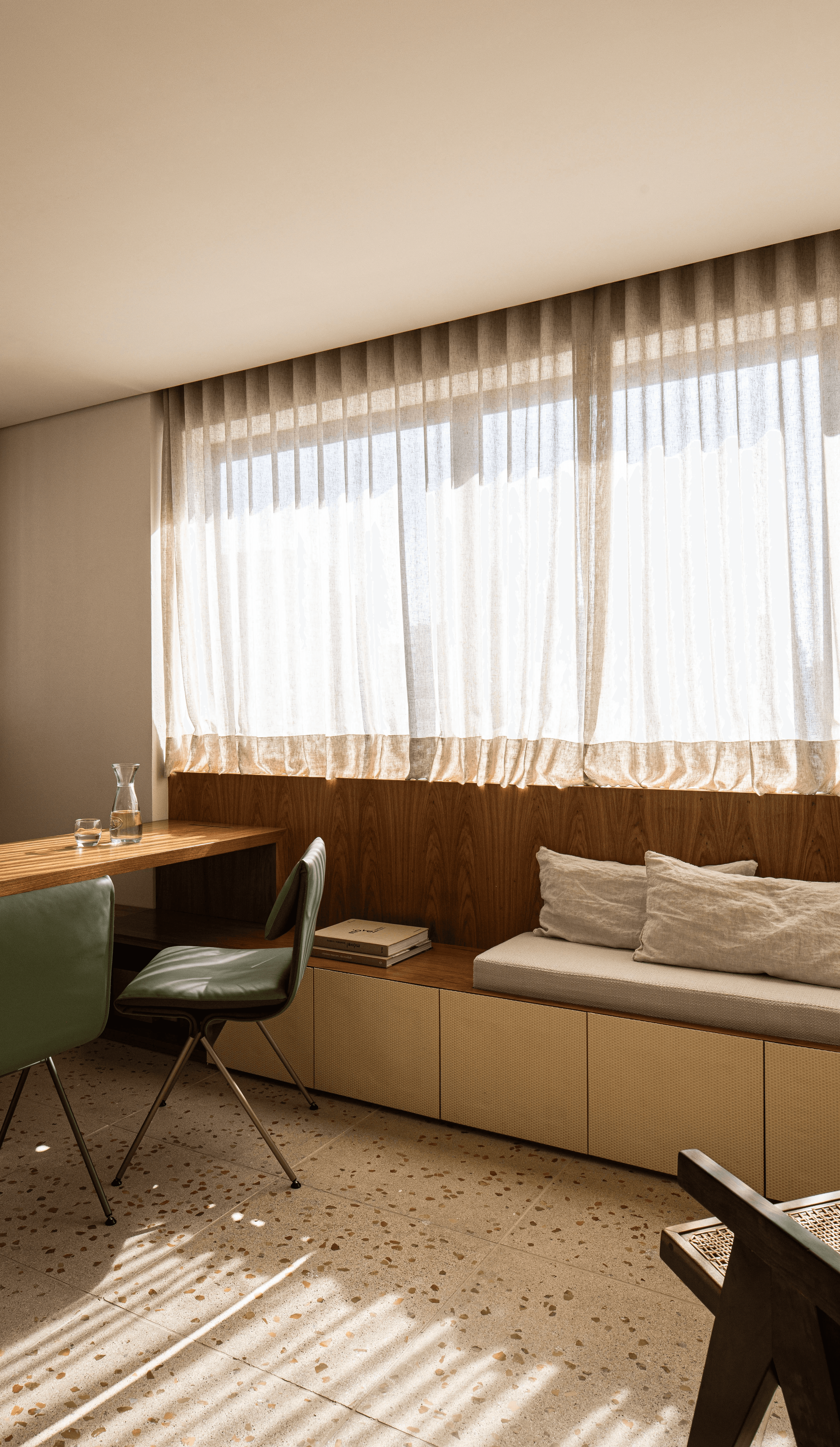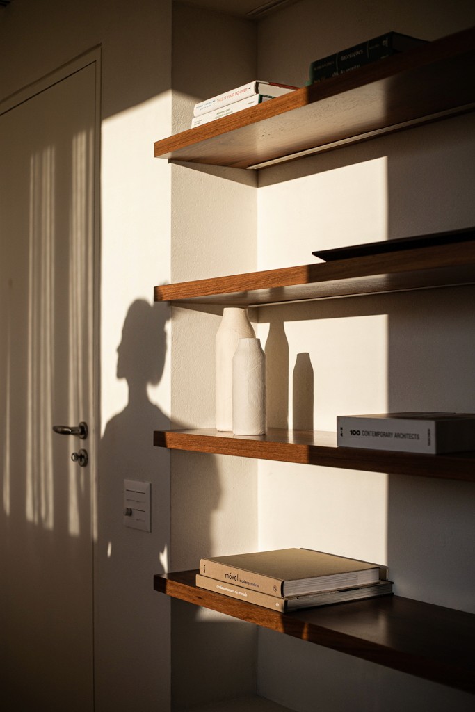 Logo na entrada, o visitante é recebido por uma câmara de descompressão — um ambiente de transição pensado para desconectar das influências externas e conduzir, de forma sutil, à área de estar.