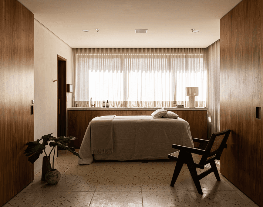 A setorização é discreta e eficiente: organiza os fluxos entre o atendimento profissional e as áreas voltadas ao relaxamento, garantindo fluidez e harmonia na experiência de uso.