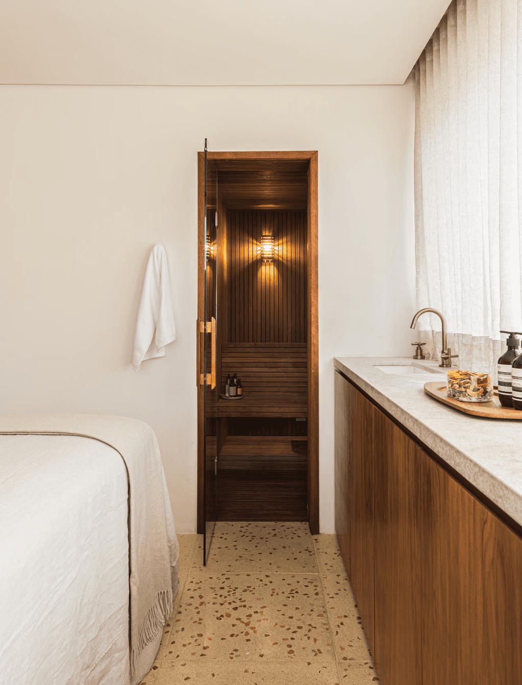 Para além das salas de consultório, o projeto também contempla um espaço de spa, equipado para massagens e terapias, além de uma sauna projetada sob medida. A divisória dessa área é um dos elementos pré-existentes do espaço, e pode ser aberta para integrar a recepção — criando, assim, um ambiente maior e versátil, ideal para palestras e eventos, como desejado pela cliente.