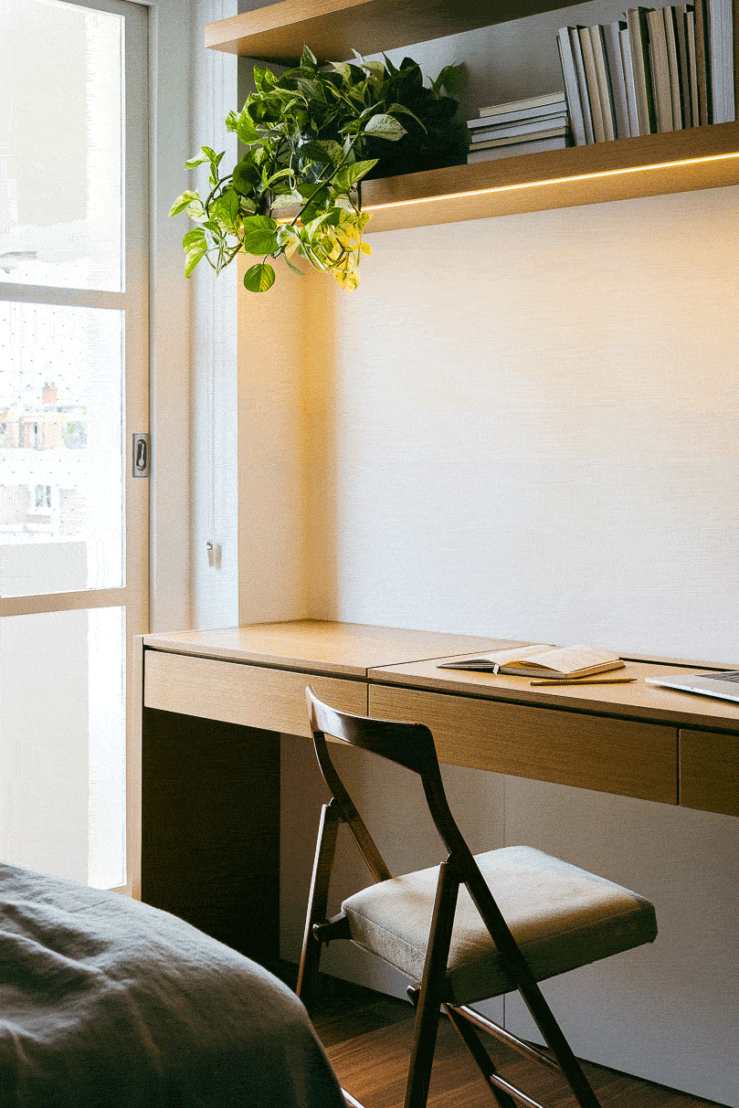 Mais do que finalizar um cômodo, tratava-se de criar ambiência para um novo capítulo da casa, traduzindo em forma e textura a delicadeza desse início: papel de parede, cortinas, luminária, tapete; escolhas que expandem o projeto anterior, mantendo a coerência do conjunto e acolhendo um novo modo de morar.
