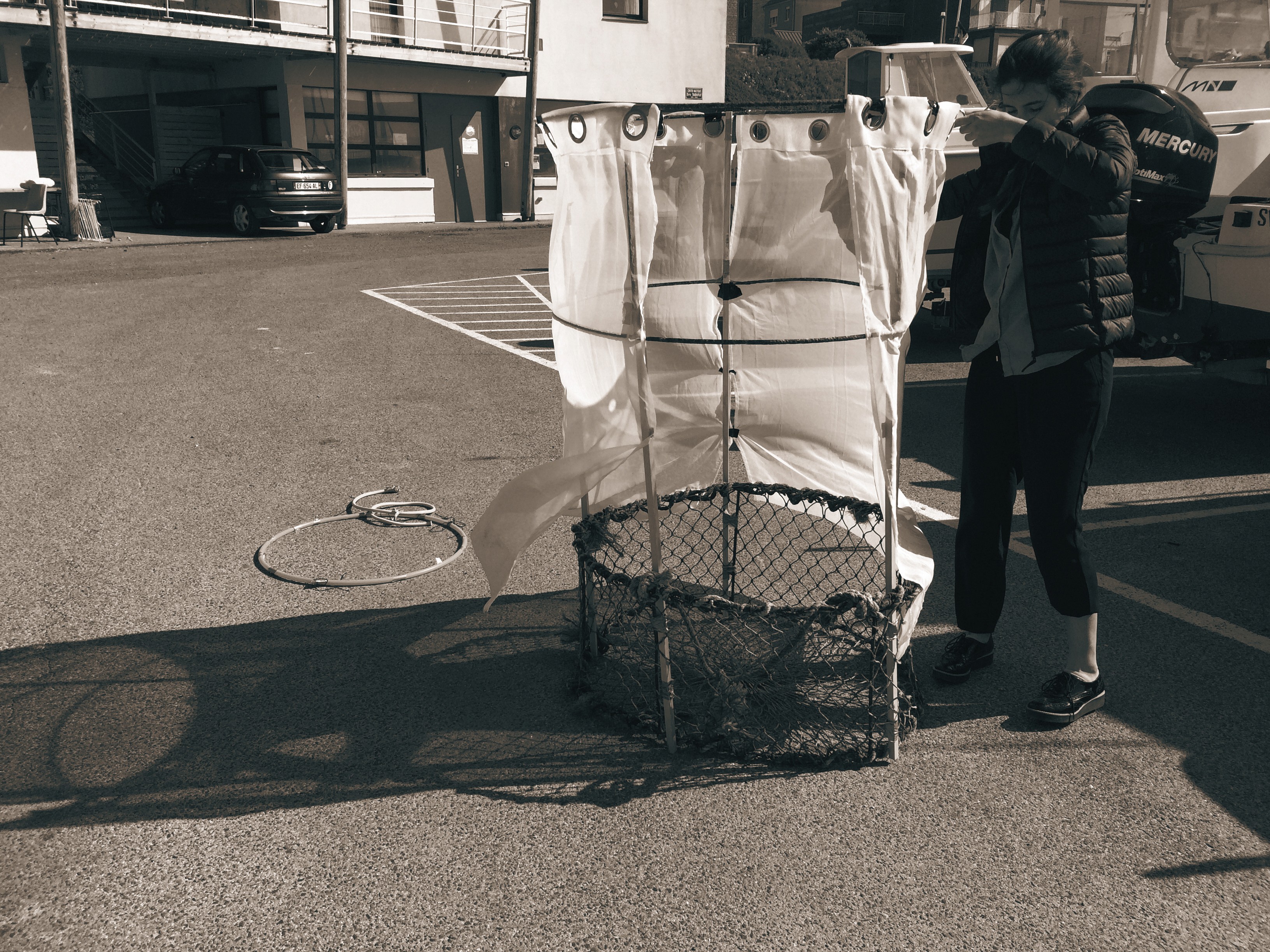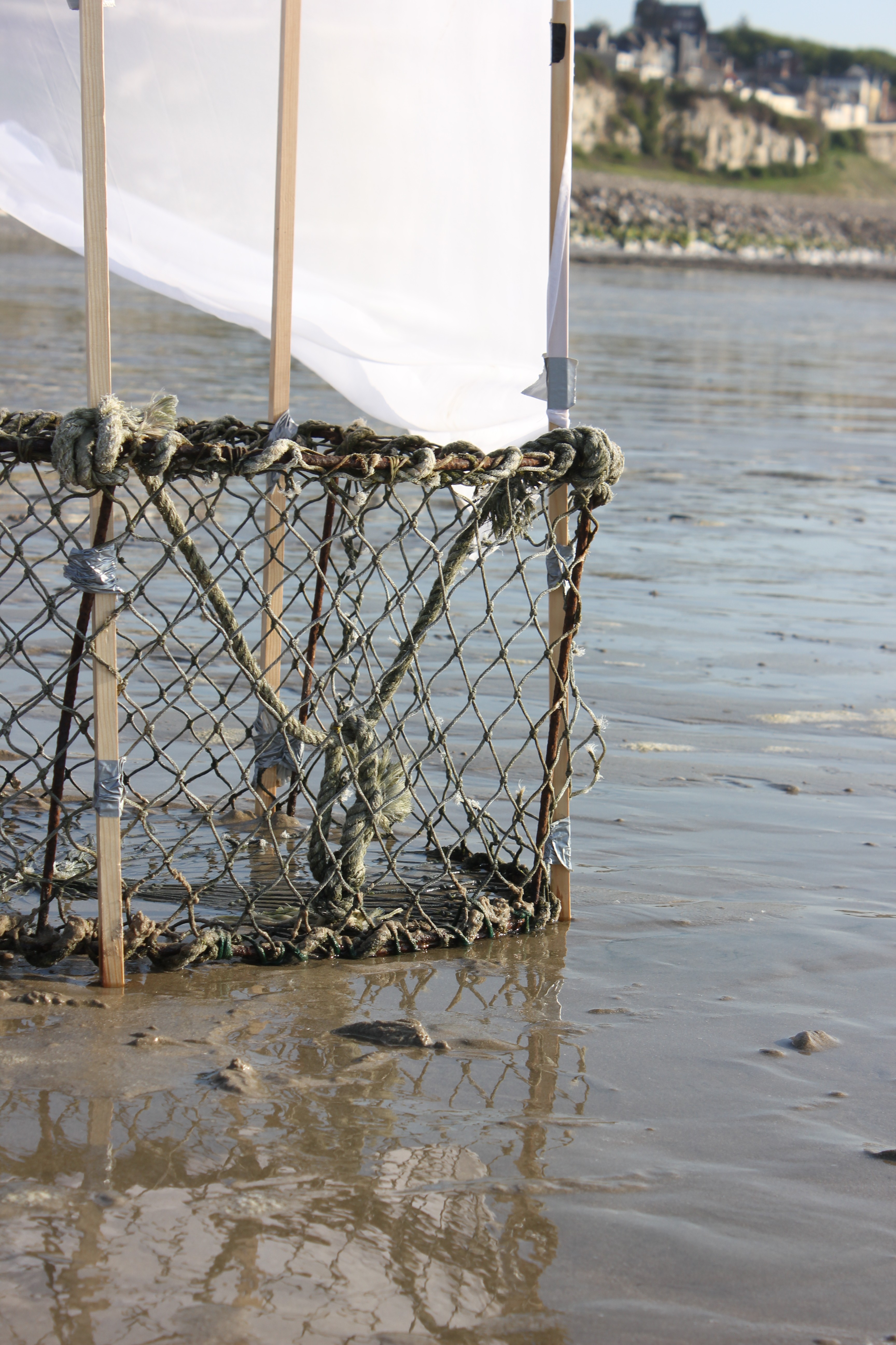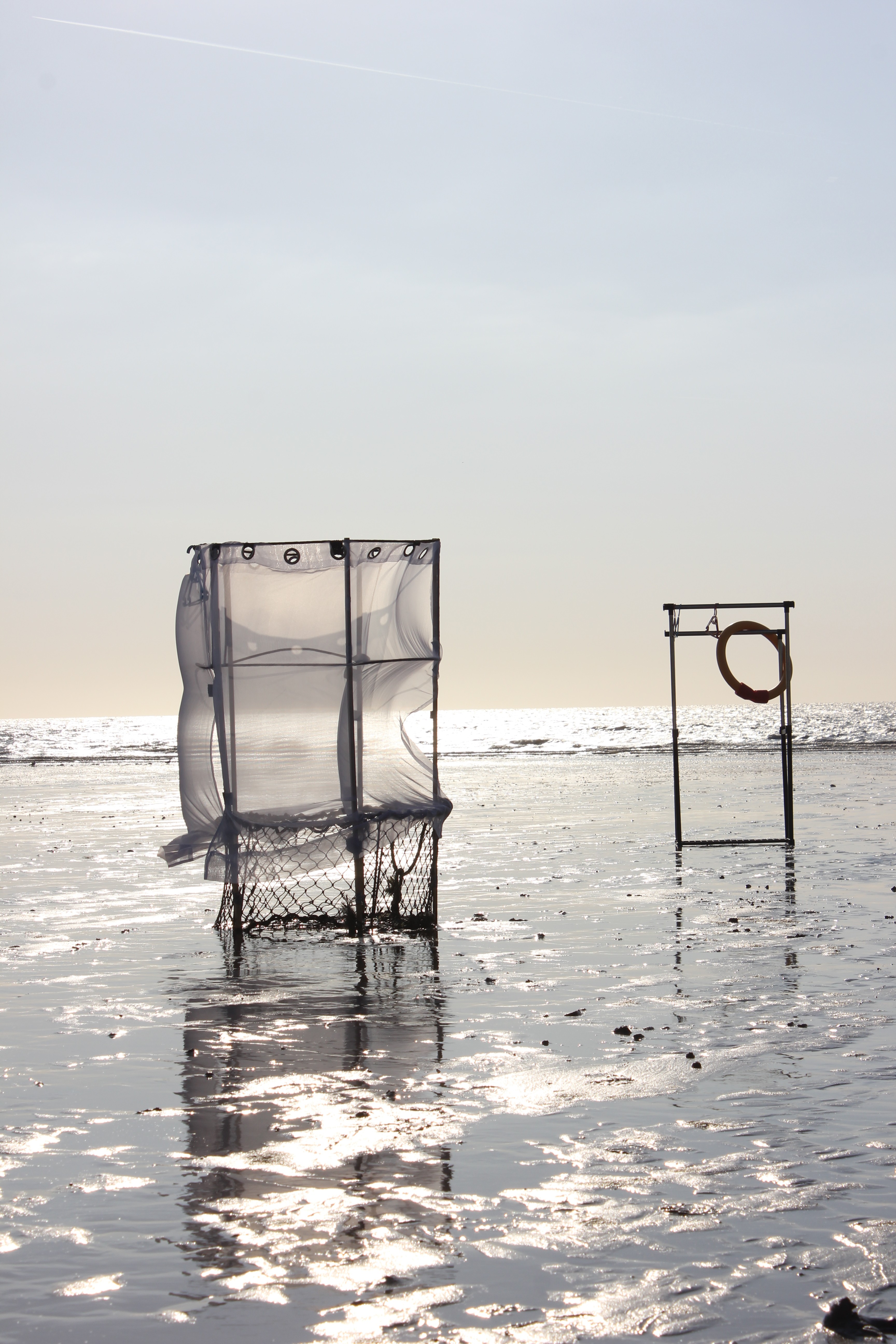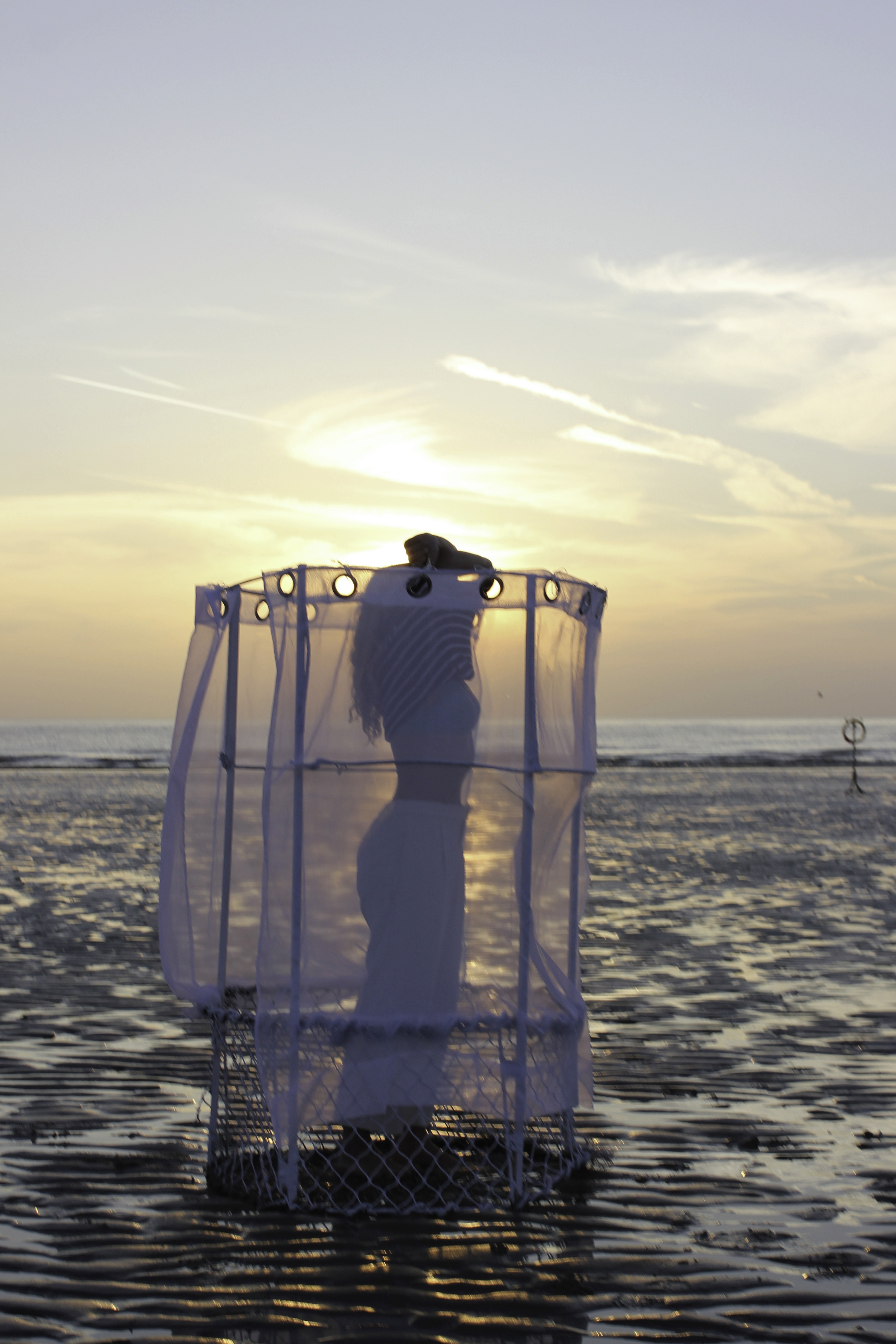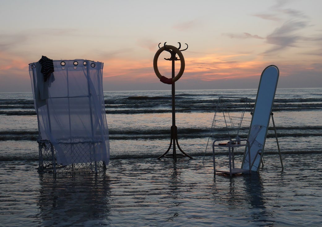 Utilizando materiais coletados em mercados locais, a equipe construiu uma cabine de banho móvel — um gesto que reinterpreta as práticas balneares do passado de forma contemporânea. A instalação, posicionada durante a maré baixa e posteriormente submersa pela maré alta, propõe um novo olhar sobre a ocupação do espaço costeiro, como um ritual lento e coletivo. A experiência reforça que qualquer transformação real e duradoura no território só pode acontecer com o envolvimento ativo da comunidade local.