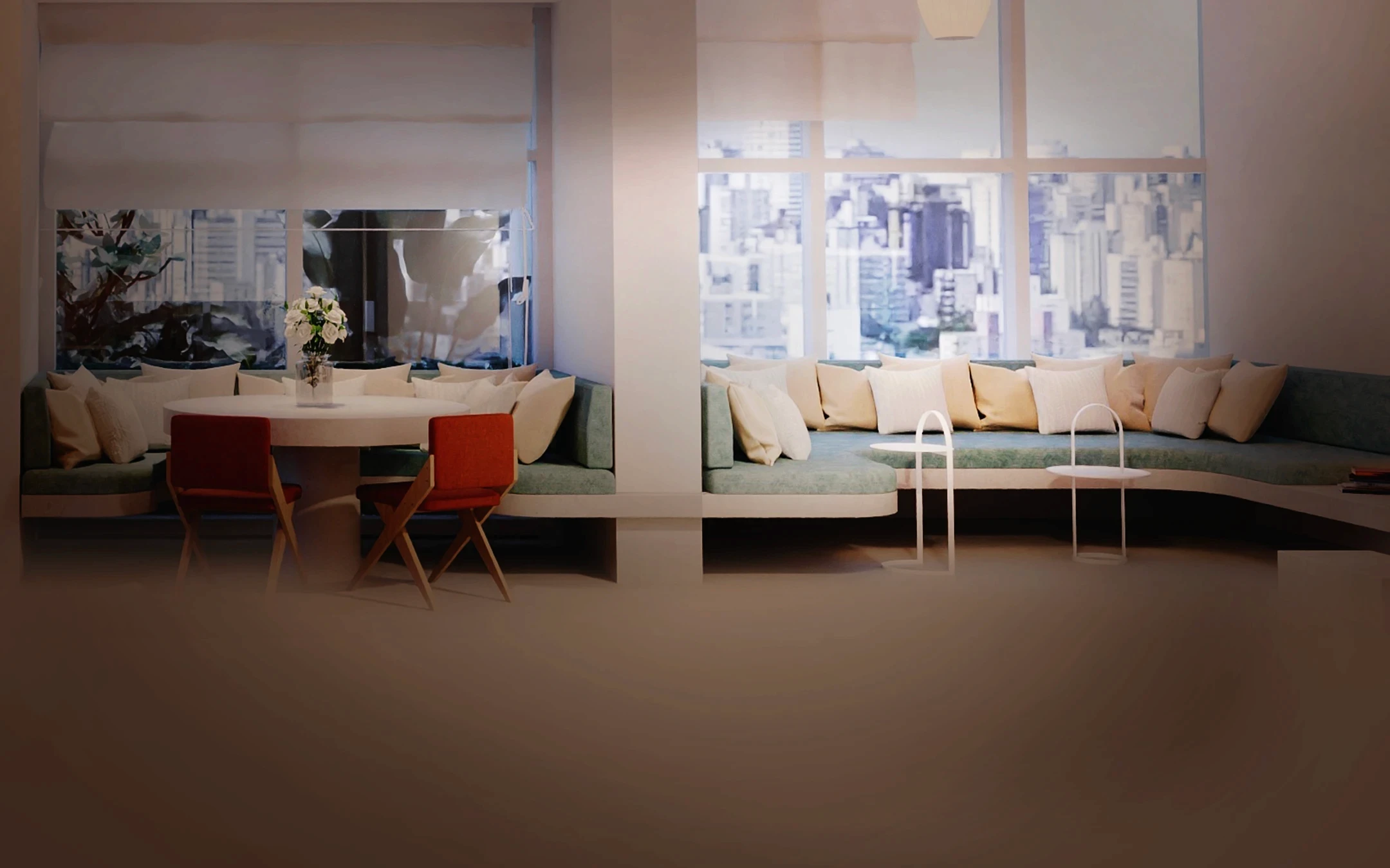 Um banco curvo atravessa os ambientes, formando núcleos acolhedores para diferentes usos. Já os painéis em madeira delimitam as áreas íntimas, compondo um diálogo sutil com as aberturas para o exterior.
